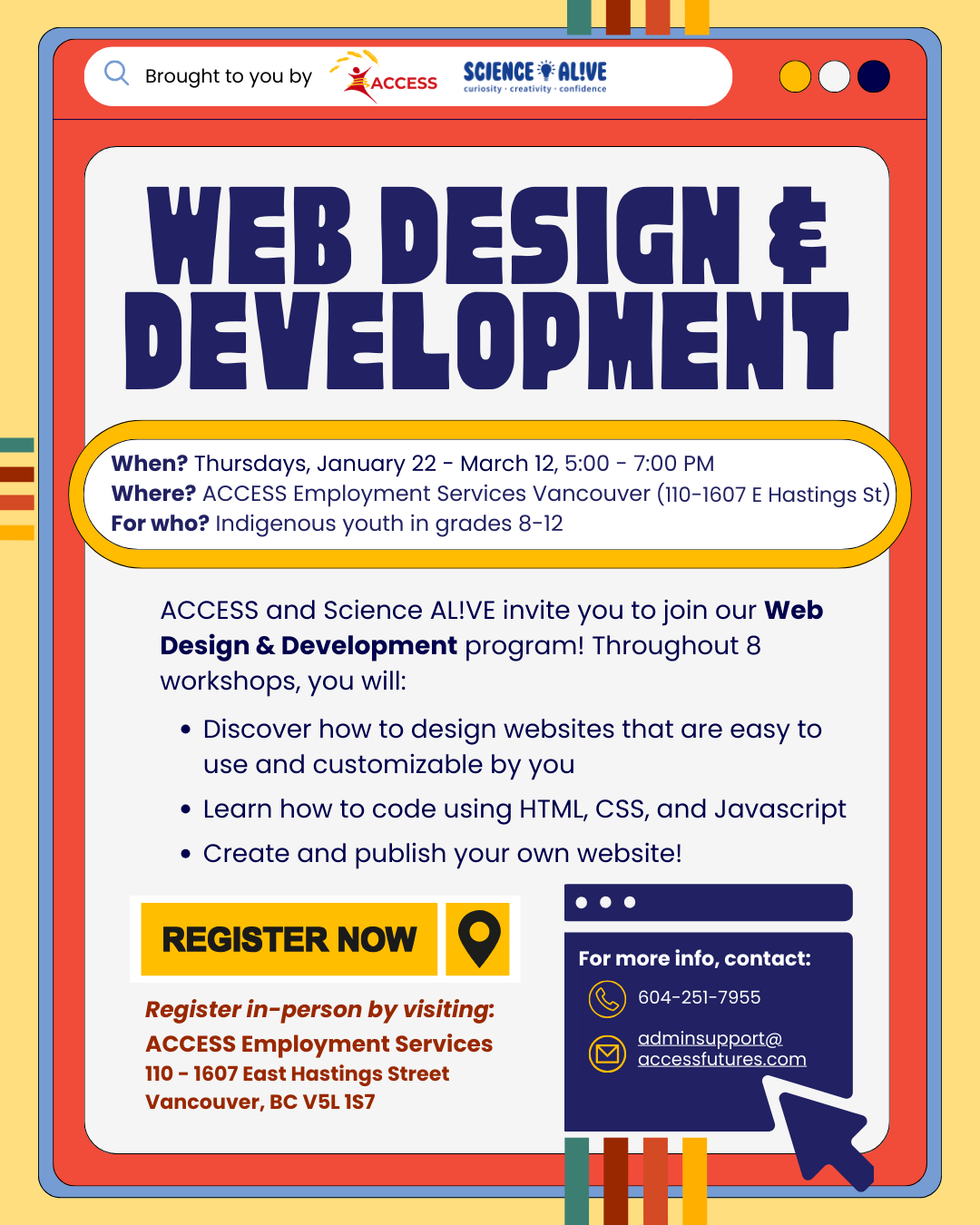 To register, contact ACCESS at adminsupport@accessfutures.com, call 604-251-7955, or visit their office.