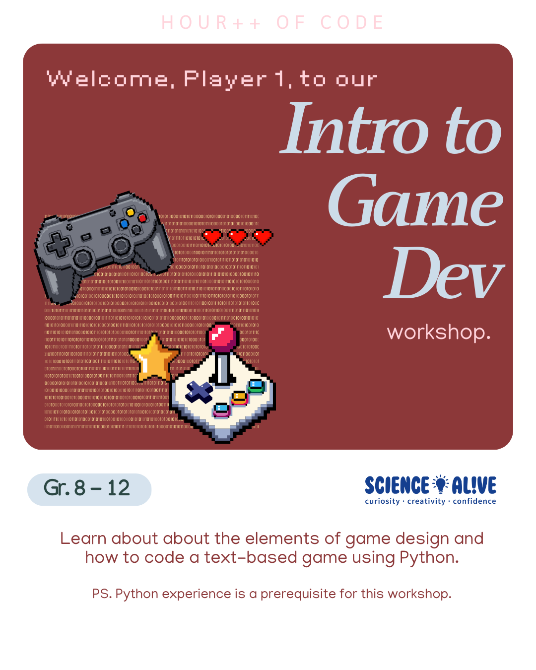 The Intro to Game Dev workshop is open to Grade 8-12 students who are interested in learning about the elements of game design and how to code a text-based game using Python.