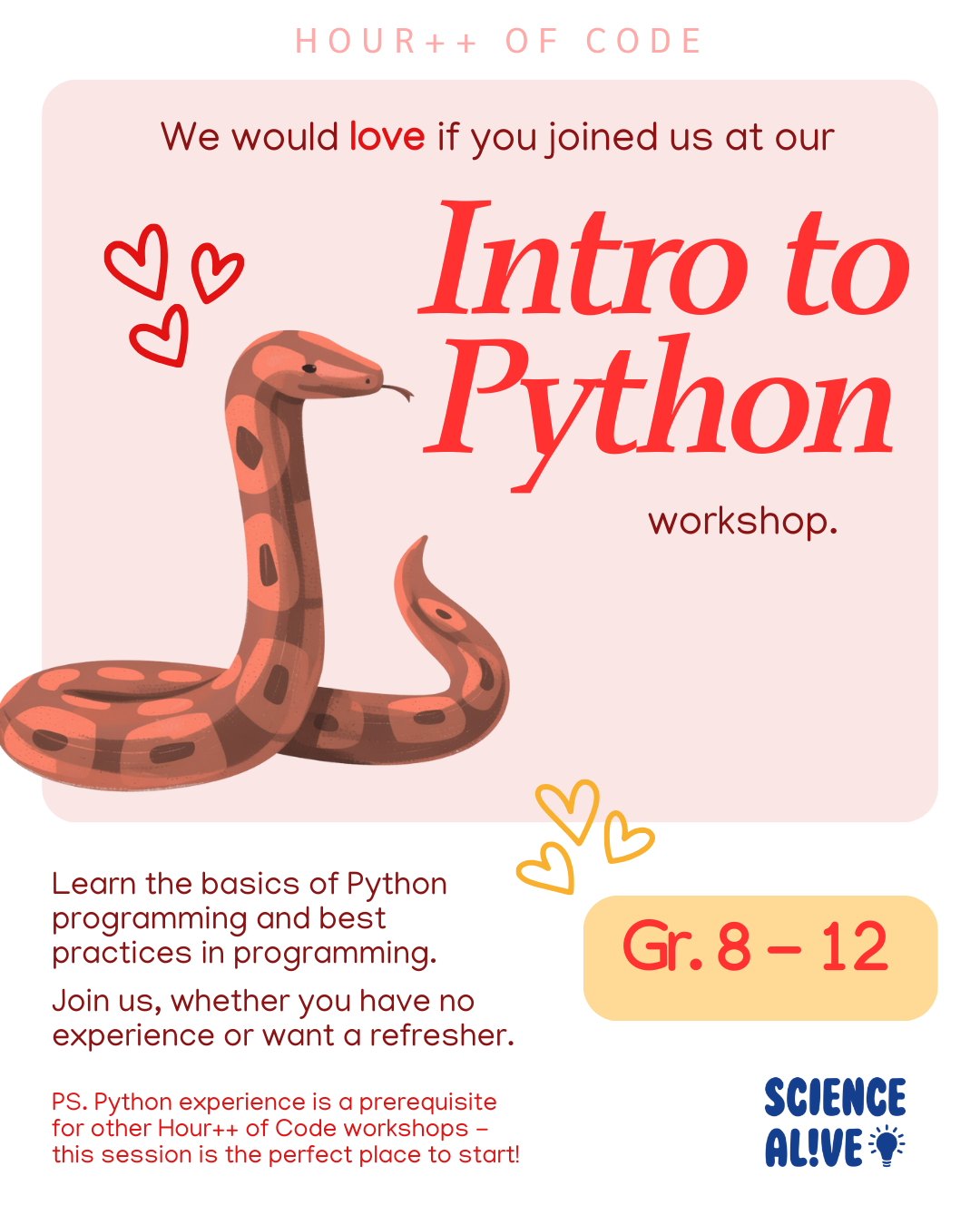 The Intro to Python workshop is open to Grade 8-12 students who are interested in learning the basics of the Python programming language and best practices in programming.