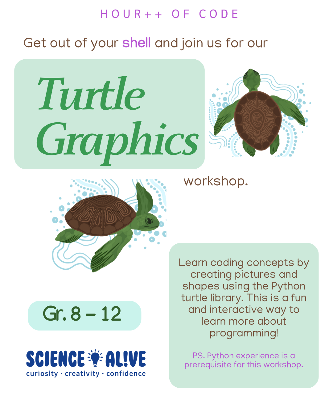 The Turtle Graphics workshop (open to grades 8-12) will introduce students to coding concepts through creating pictures and shapes on a virtual canvas, using the Python turtle library.